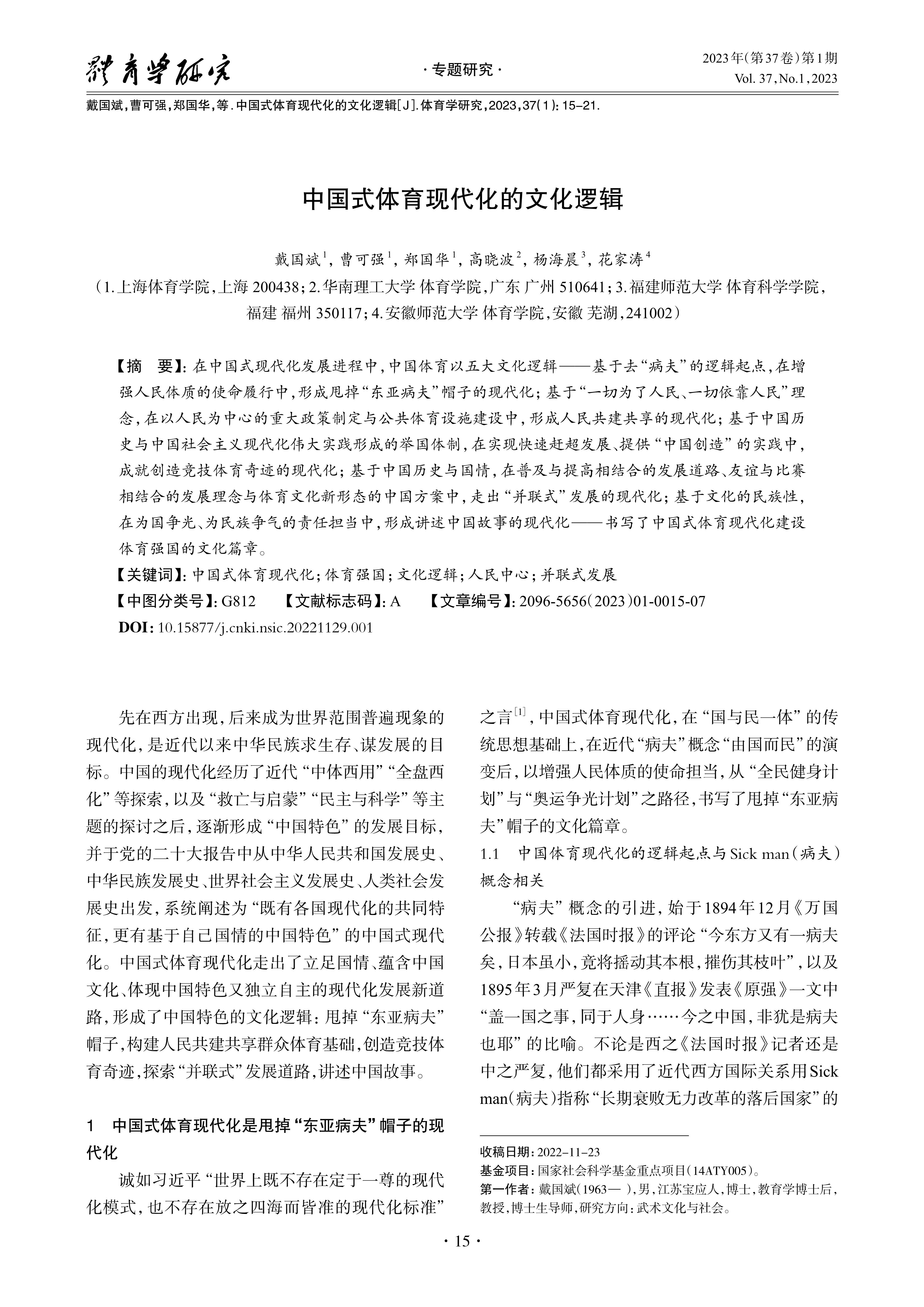 During the development of Chinese modernization,Chinese sports has written a cultural chapter in achieving Chinese sports modernization and building a leading sporting nation by following the Chinese path and five branches of cultural logic. These branches of cultural logic include:based on the starting logic of getting rid of the label of the ‘sick man’ and fulfilling the mission of enhancing the physical fitness of the people,Chinese sports would dedicate to the modernization that shakes off the label of ‘sick man of East Asia’;based on the concept of doing everything for the people while relying on the people in everything they do,and following a people-centered approach to developing major policies and building public sports facilities,Chinese sports would shape the sports modernization that features joint building and sharing;based on the new system for mobilizing resources nationwide which had been constructed through the Chinese history and the great practice of Chinese socialist modernization,Chinese sports would work on the modernization that creates competitive sport wonders in achieving rapid catch-up development and providing ‘Chinese creation’;based on China’s history and national conditions,as well as the Chinese path that features the combination of popularization with improvement,the integration of friendship with competition and a new form of sports culture,Chinese sports would see parallel development in the process of modernization; based on the nationality of the culture and the responsibility of fighting for national glory,Chinese sports would achieve modernization of China’s own narrative.