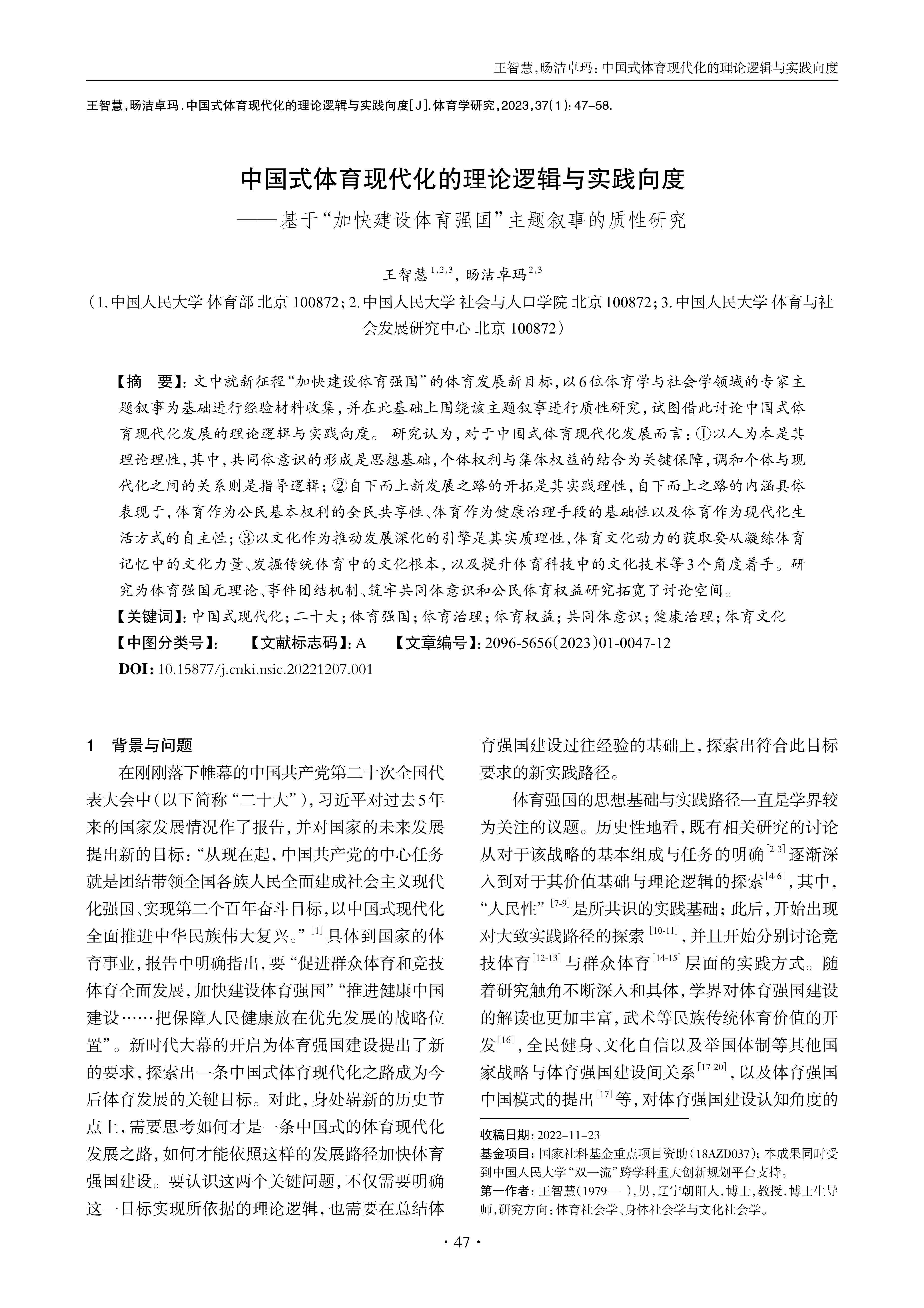 Guided by the objective of “moving faster to build China into a country strong in sports”on the new journey, a qualitative study was conducted on its thematic narrative,with a basis on a semi-constructed interview with six experts in sociology and sport. In so doing,it is intended to figure out the theoretical logic and practical orientation for the Chinese path to sport modernization. And we thought that for the goal of Chinese sport modernization,firstly,people-centred approach is the theoretical rationality,which could be divided into three parts that community consciousness is the very basis,while the combination of individual rights and collective interests is the key requisite and its practical logic is about to mediate the relationship between human and modernization. Then,the new bottom-up development road is practical rationality, and its connotation is manifested by the sharing of sports as citizens’ basic rights,the foundation of sports as a means of health governance,and the autonomy of sports as a modern way of life. And finally,taking culture as the engine to promote development is its substantive rationality. The acquisition of sports cultural power should start from three aspects:refining the cultural power in sports memory,exploring the cultural roots in traditional sports,and improving the cultural technology in sports science and technology. The research expands the discussion for the study of meta-theory of leading sporting nations, event solidarity mechanism,community awareness and citizens’ sports rights and interests.