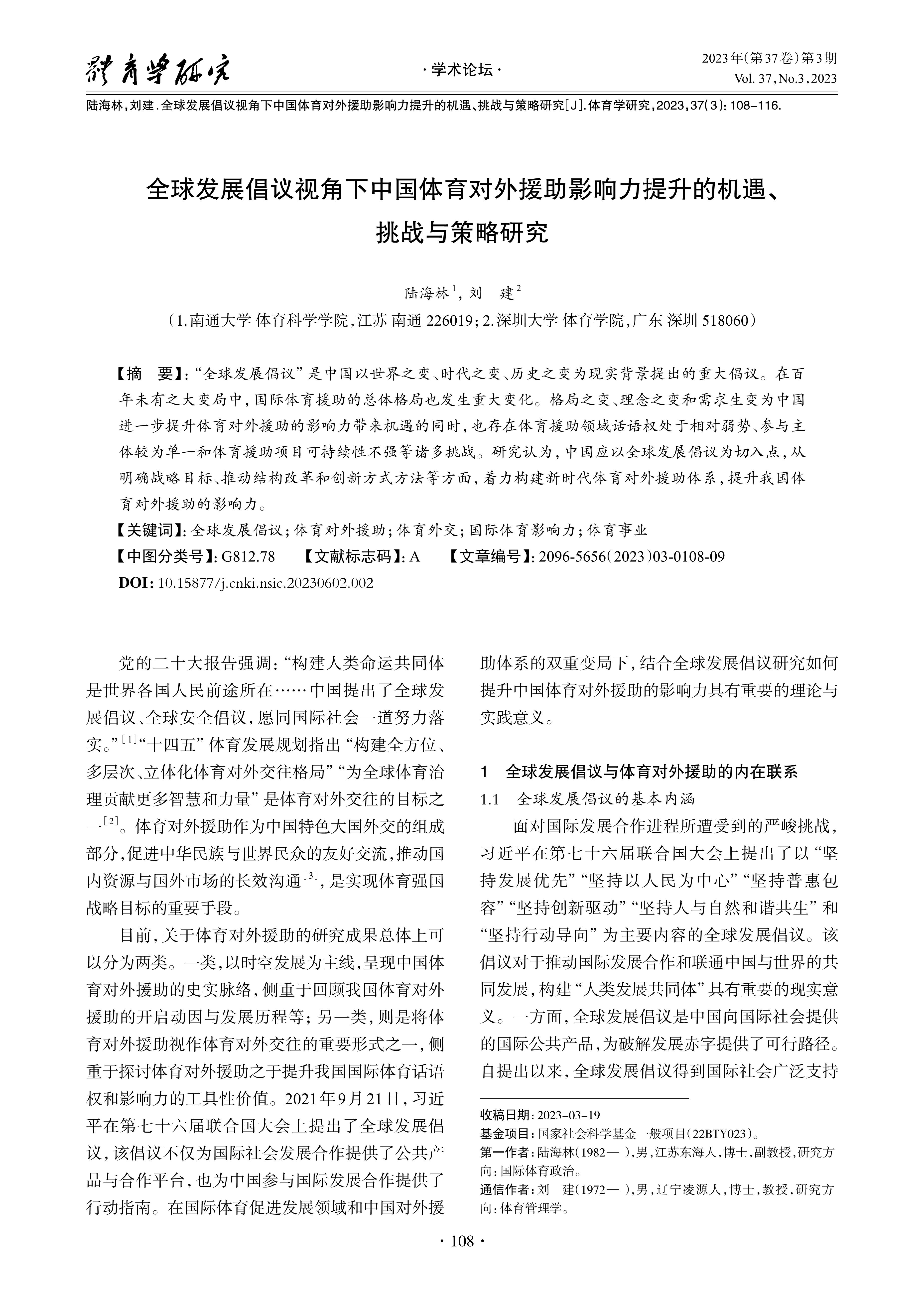 “全球发展倡议”是中国以世界之变、时代之变、历史之变为现实背景提出的重大倡议。在百年未有之大变局中,国际体育援助的总体格局也发生重大变化。格局之变、理念之变和需求生变为中国进一步提升体育对外援助的影响力带来机遇的同时,也存在体育援助领域话语权处于相对弱势、参与主体较为单一和体育援助项目可持续性不强等诸多挑战。研究认为,中国应以全球发展倡议为切入点,从明确战略目标、推动结构改革和创新方式方法等方面,着力构建新时代体育对外援助体系,提升我国体育对外援助的影响力。
