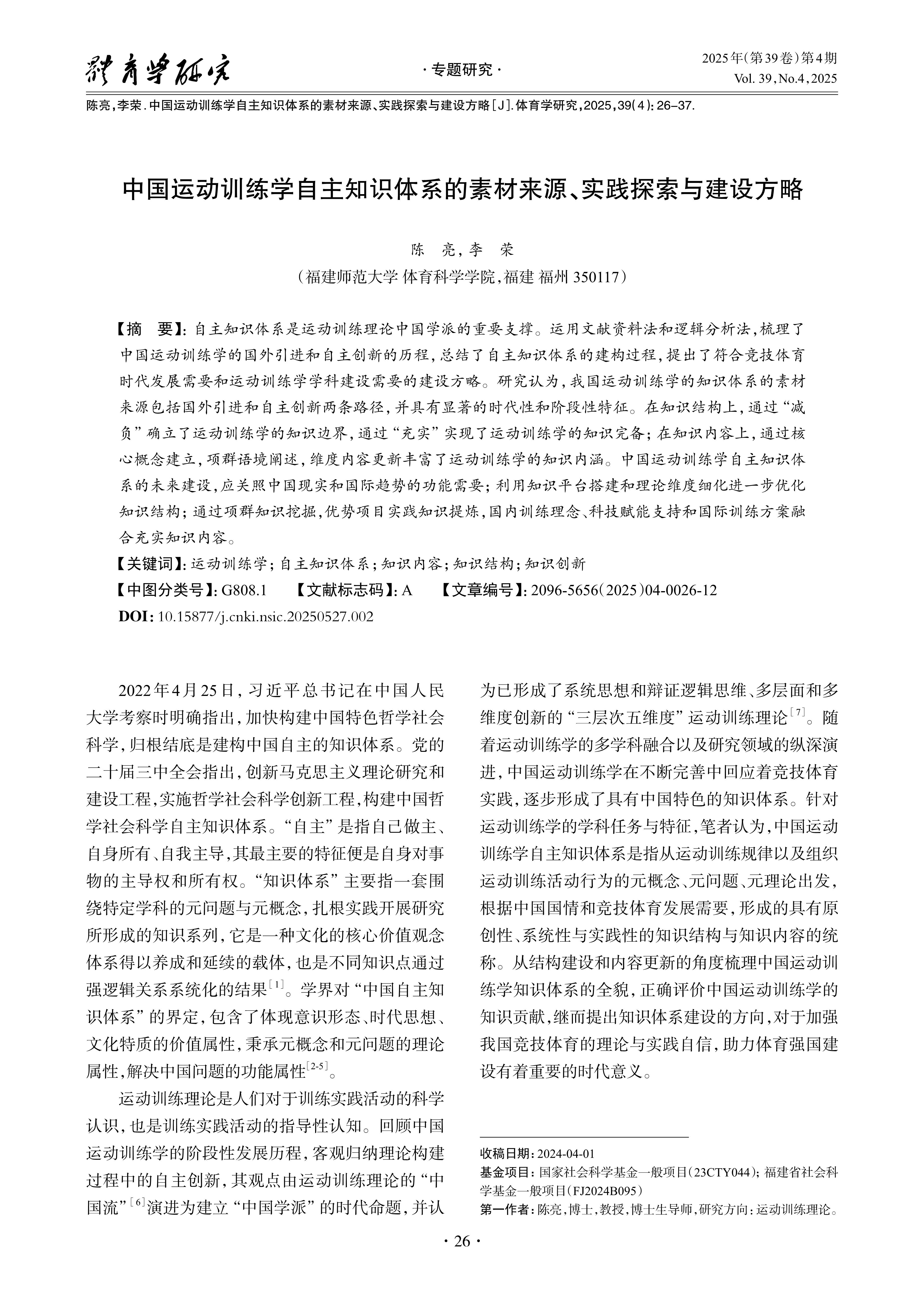 陈亮,李荣.中国运动训练学自主知识体系的素材来源、实践探索与建设方略[J].体育学研究,2025,39(4):26-37