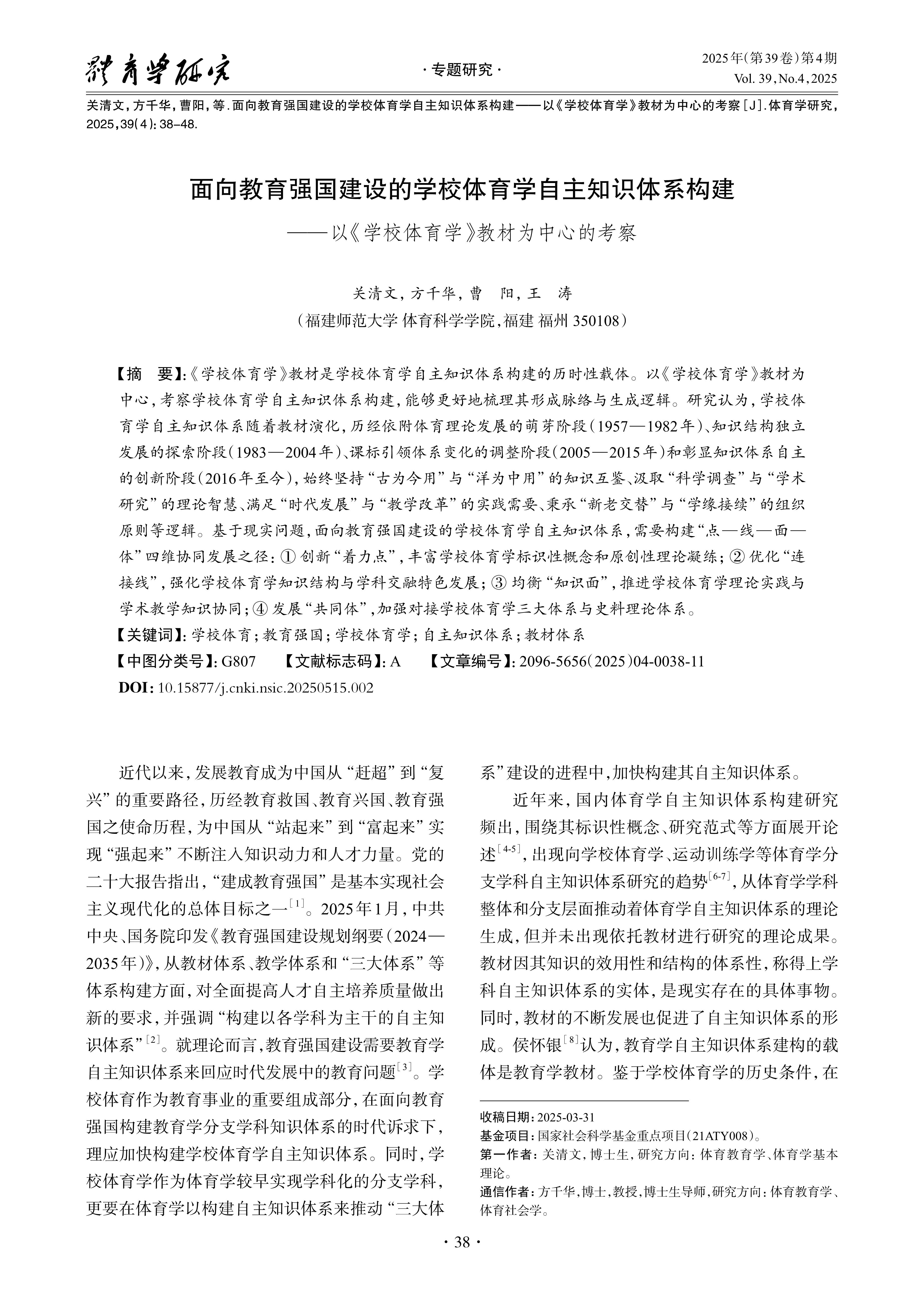 关清文,方千华,曹阳,等.面向教育强国建设的学校体育学自主知识体系构建——以《学校体育学》教材为中心的考察[J].体育学研究,2025,39(4):38-48
