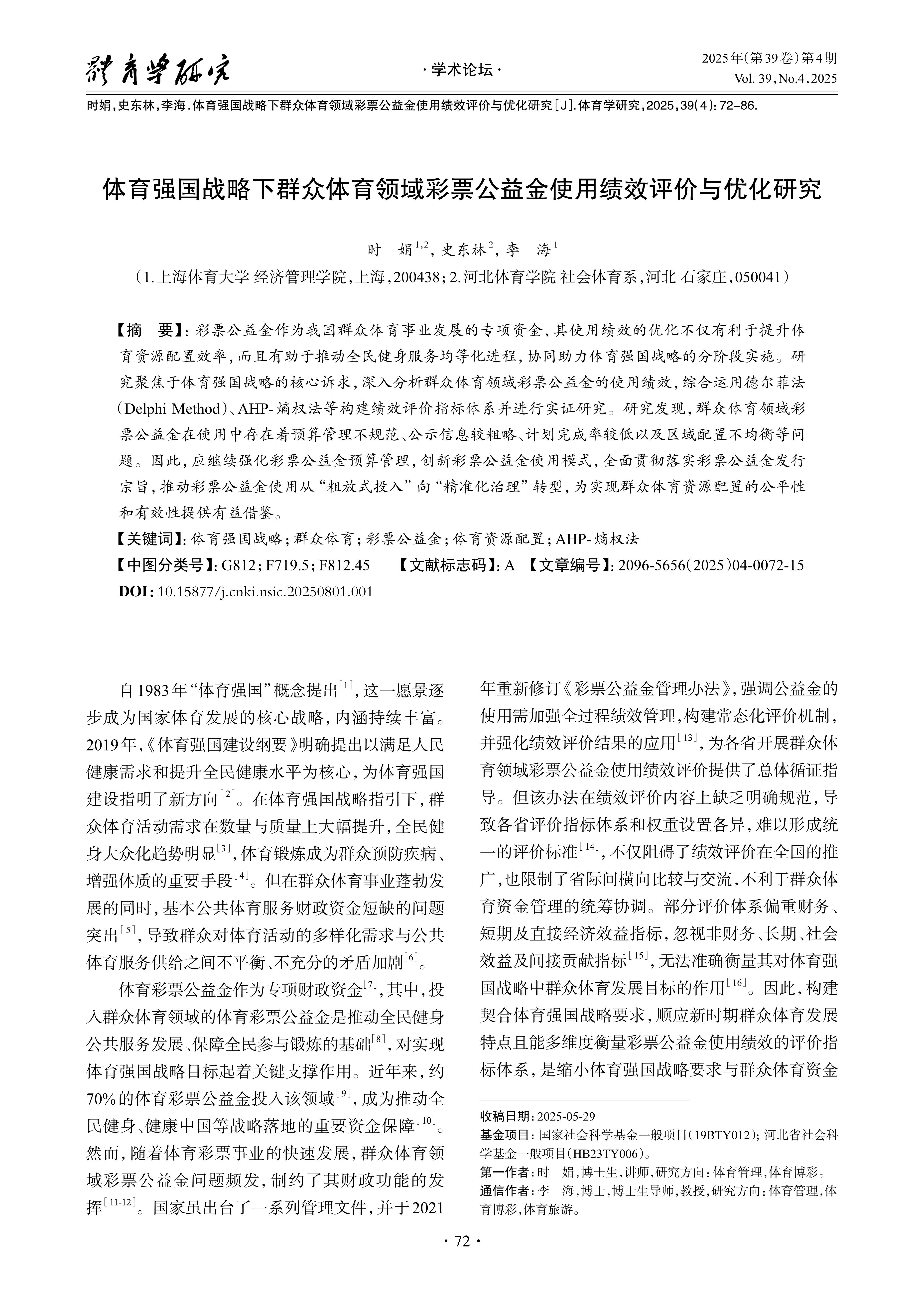 时娟,史东林,李海.体育强国战略下群众体育领域彩票公益金使用绩效评价与优化研究[J].体育学研究,2025,39(4):72-86