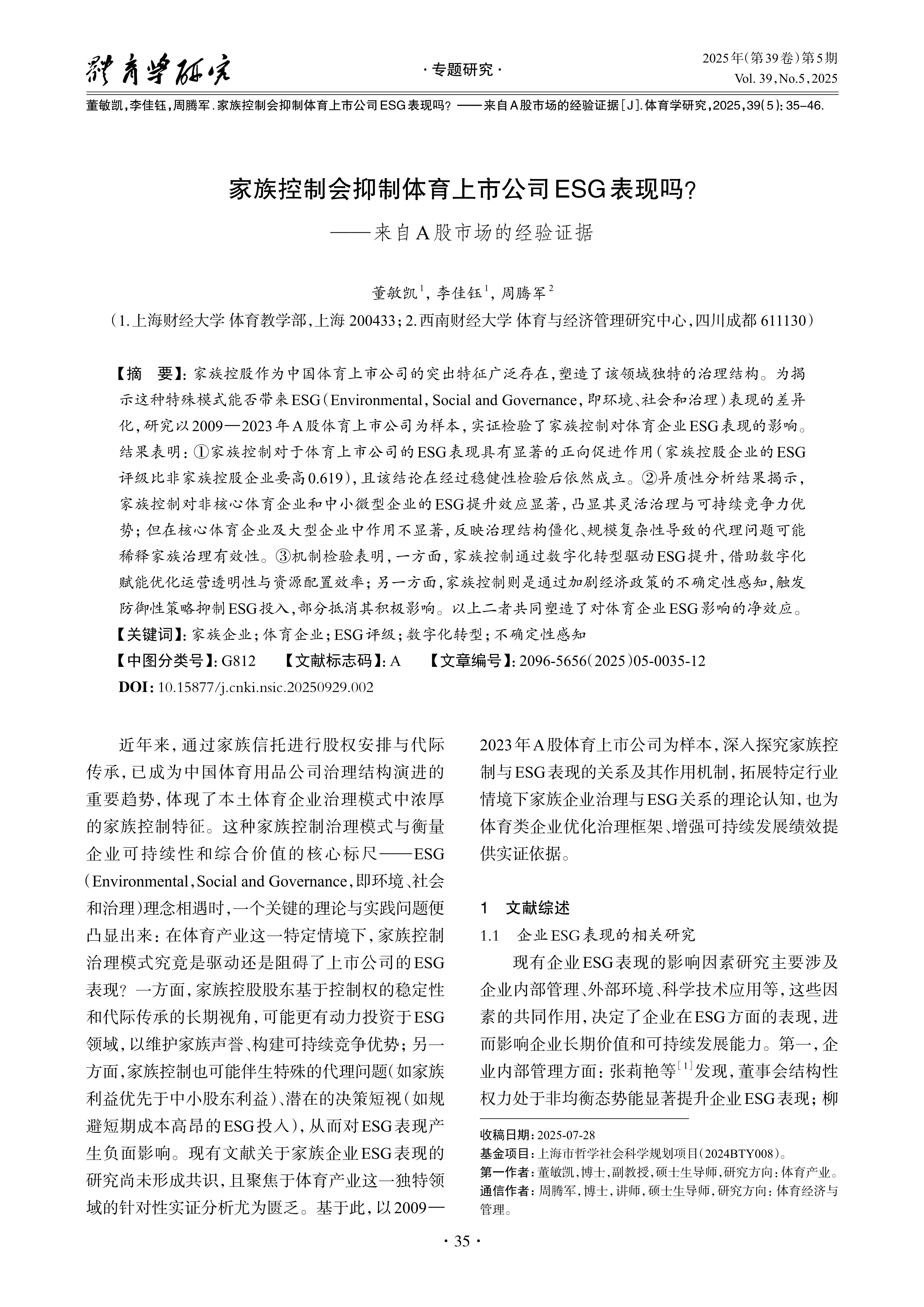 家族控制会抑制体育上市公司 ESG 表现吗?——来自 A 股市场的经验证据