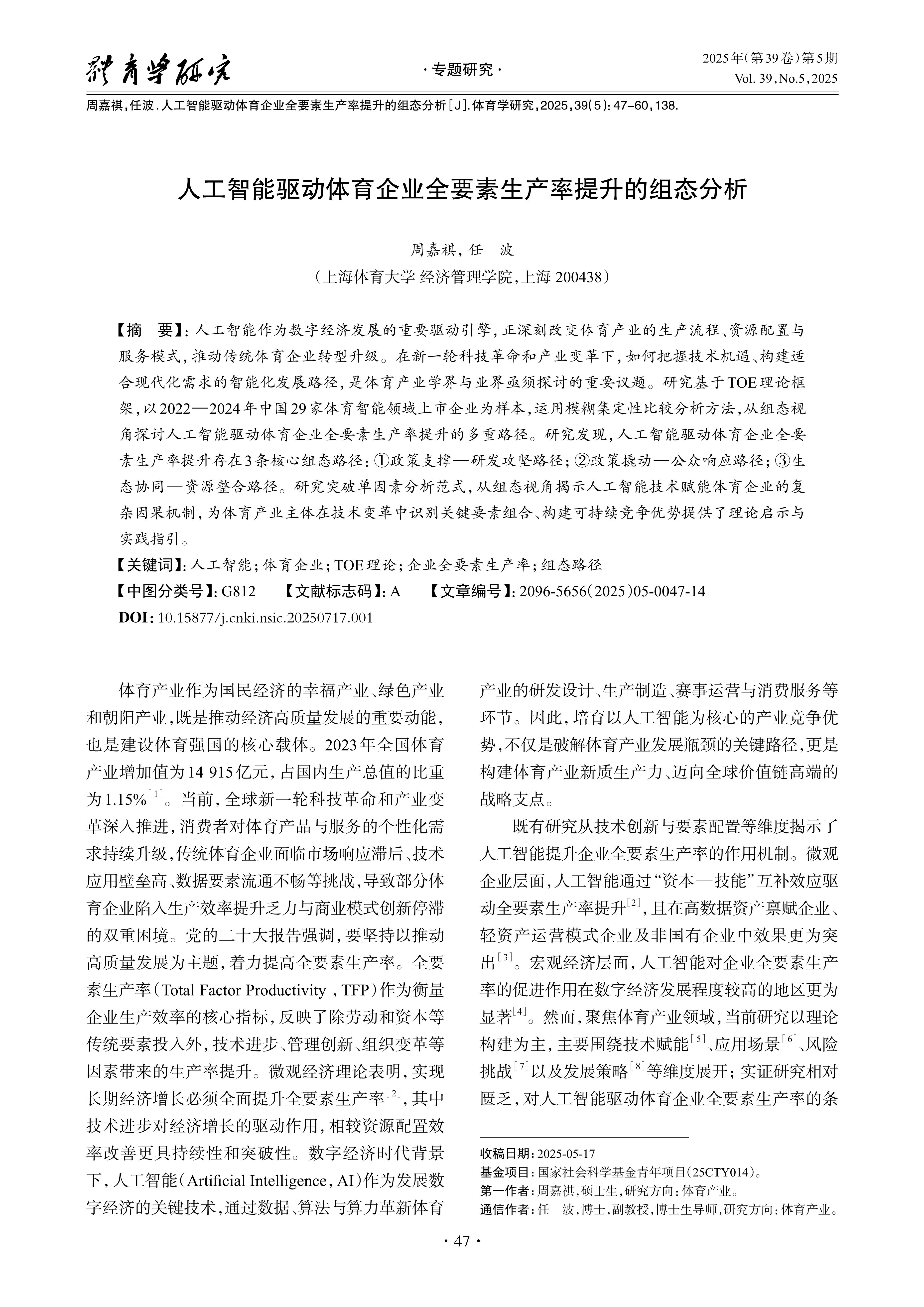 人工智能驱动体育企业全要素生产率提升的组态分析