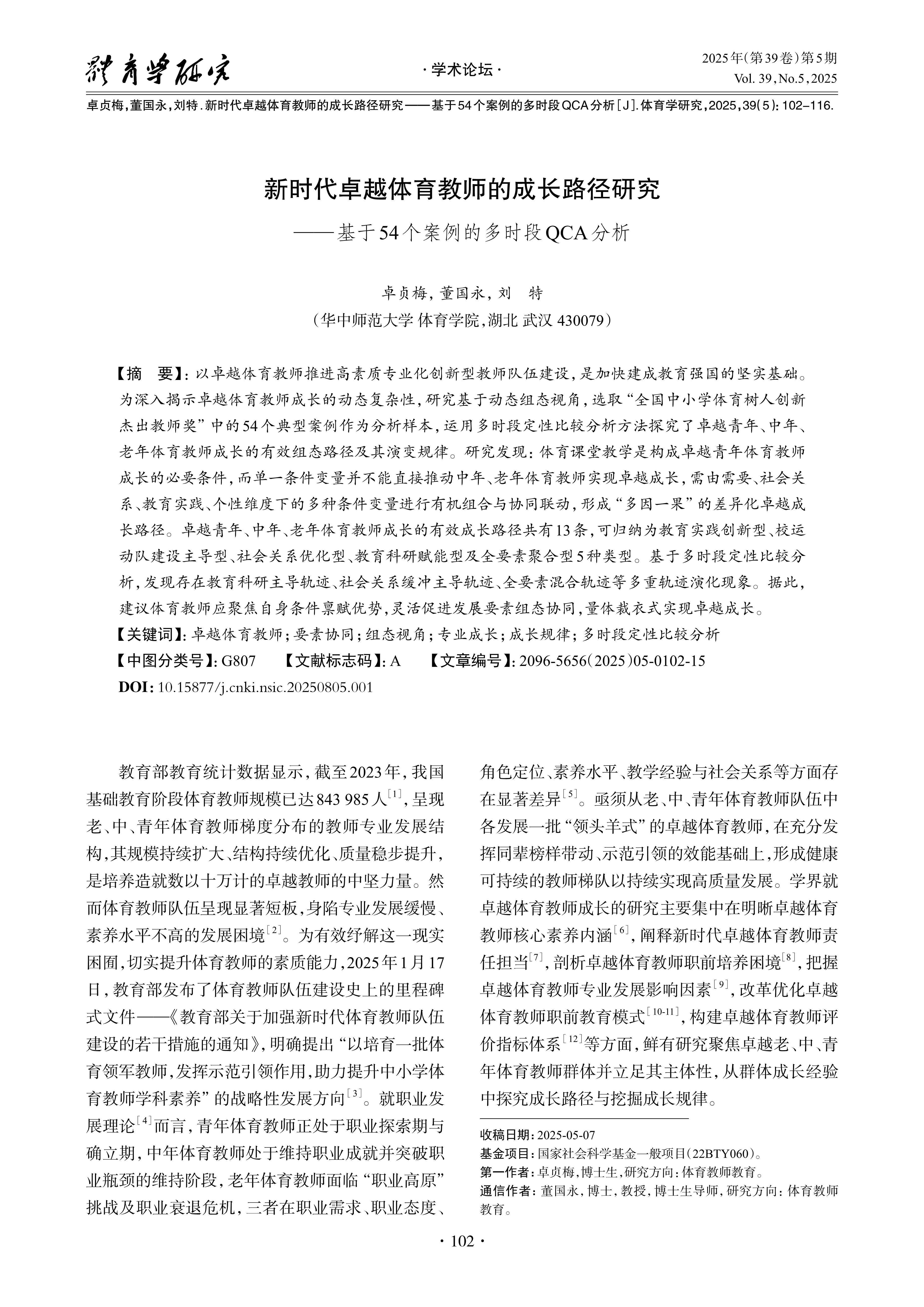 卓贞梅, 董国永, 刘 特.新时代卓越体育教师的成长路径研究——基于 54 个案例的多时段 QCA 分析[J].体育学研究,2025,39(5):102-116